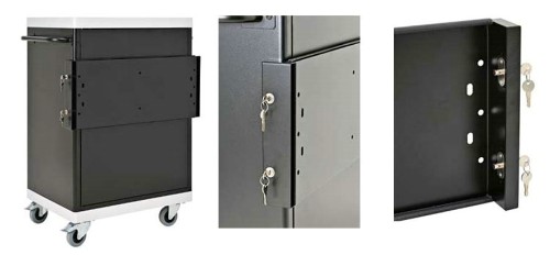 The device is mounted on a solid wall and the NoteCart is positioned with the door facing in to the fixture. This prevents access through the door when the unit is stored. NoteSecure is avaliable for all of our NoteCart.
